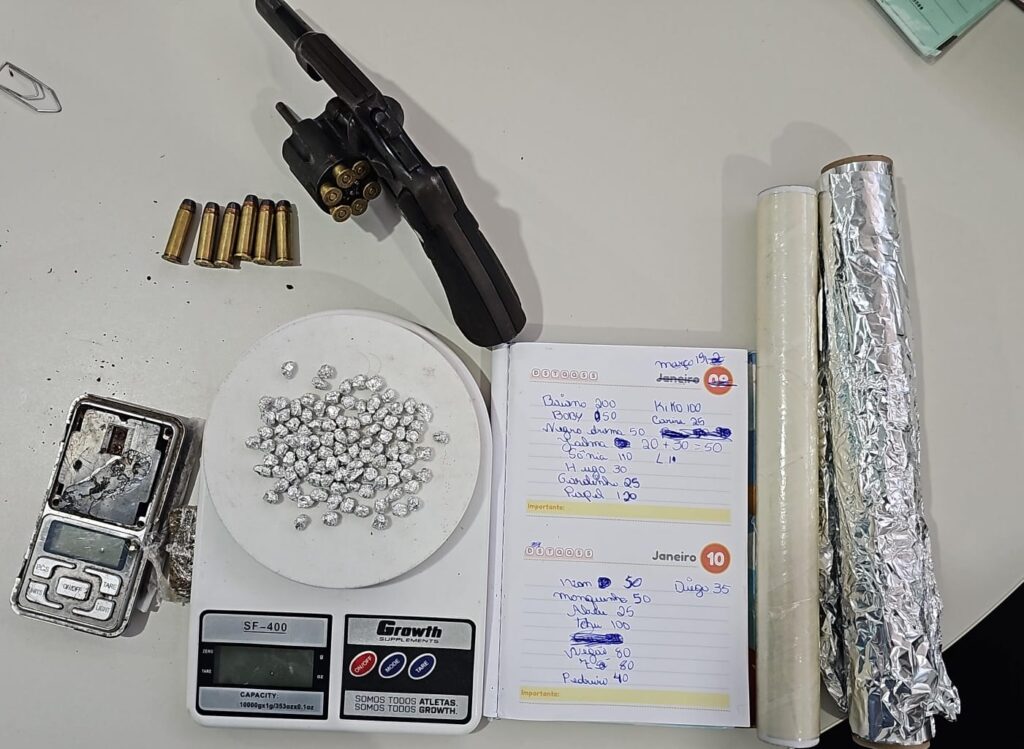 No imóvel, foi apreendido uma arma de fogo calibre .38 municiada com seis munições, uma bolsa contendo outras seis munições do mesmo calibre, 102 pedras de crack, balança de precisão, caderno de contabilidade do tráfico e materiais utilizados para embalar.